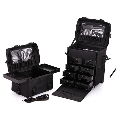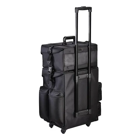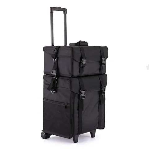 2in 1 Black Soft Rolling Makeup Case Specification -  The soft fabric  of vanity   will protect  your beauty products from breakages and damages . Most durable makeup cases as with the strong nylon fabrics . The bottom has a large compartment with drawers for storage of your items. The lightweight wheels nature makes mobility easier.